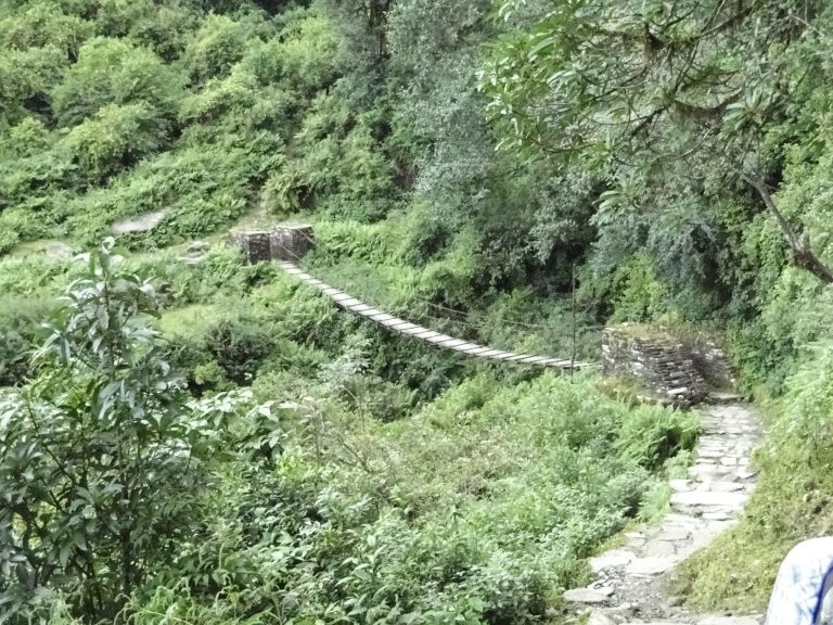 Chemin agréable en balcon pour rejoindre le cours de la rivière, puis traversée d’une forêt de rhododendrons géants. Arrivée à Tadapani, vue sur la vallée qui va vers le sanctuaire de l’Annapurna.