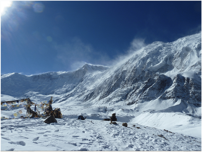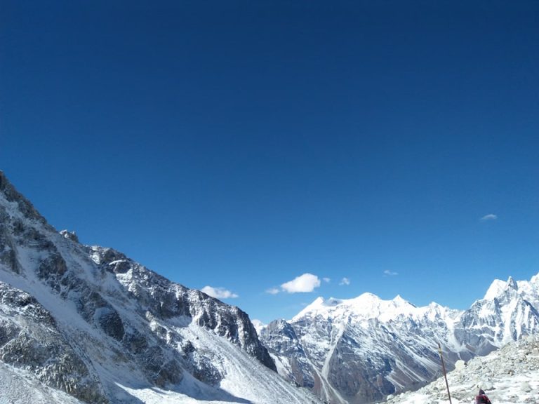 Départ vers 4 h du matin et montée progressive vers le col de Larkya jusqu’ à 5213 m. Le sentier suit le coté nord d’un glacier et rejoint la moraine rocailleuse. En cas de chute de neige pendant la nuit, il est important partir très tôt le matin pour éviter la neige fondue dans laquelle on s’enfonce. La montée est sans difficulté mais très longue. Après un petit lac, montée raide jusqu’à un cairn décoré de drapeaux de prières marquant le col de Larkya. Vue sur le Himlung Himal, le Kang Guru, le Cheo Himal (6812 m ), et au loin, l’Annapurna II ( 7937 m ). Descente abrupte dans la neige, puis dans les cailloux. Difficile et glissant lorsque la glace recouvre les parois. Camp à Bimtang (3590 m). Ce village d’été est entouré de sommets enneigés. Prendre suffisamment d’eau pendant cette journée, il n’y a pas de possibilité de recharger sa gourde.