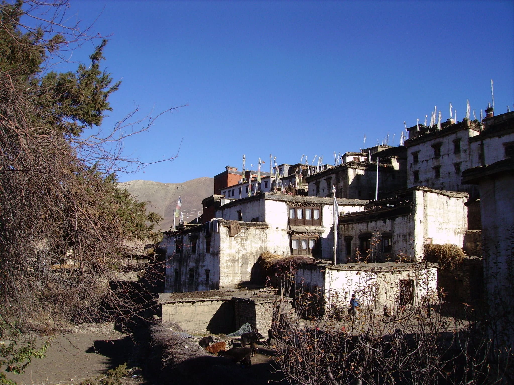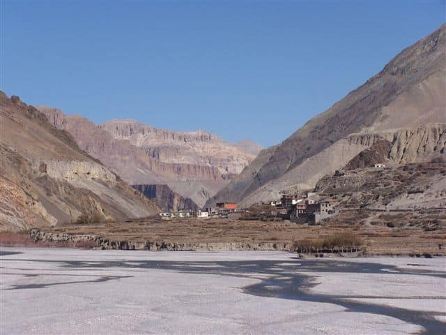 Descente dans la vallée de la Kaligandaki qui offre un paysage totalement différent avec une vue sur le paysage désertique du Mustang. Nuit à Jomsom, village Thakali (ethnie de la vallée).